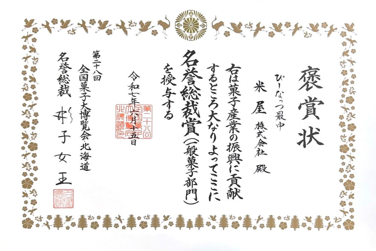| 2014年(平成26年)06月 | ぴーなっつ最中 開発者がその功績により、全国和菓子協会から和菓子会の名誉ある称号である「伝統和菓子職」に認定される。 |